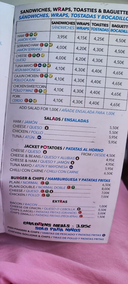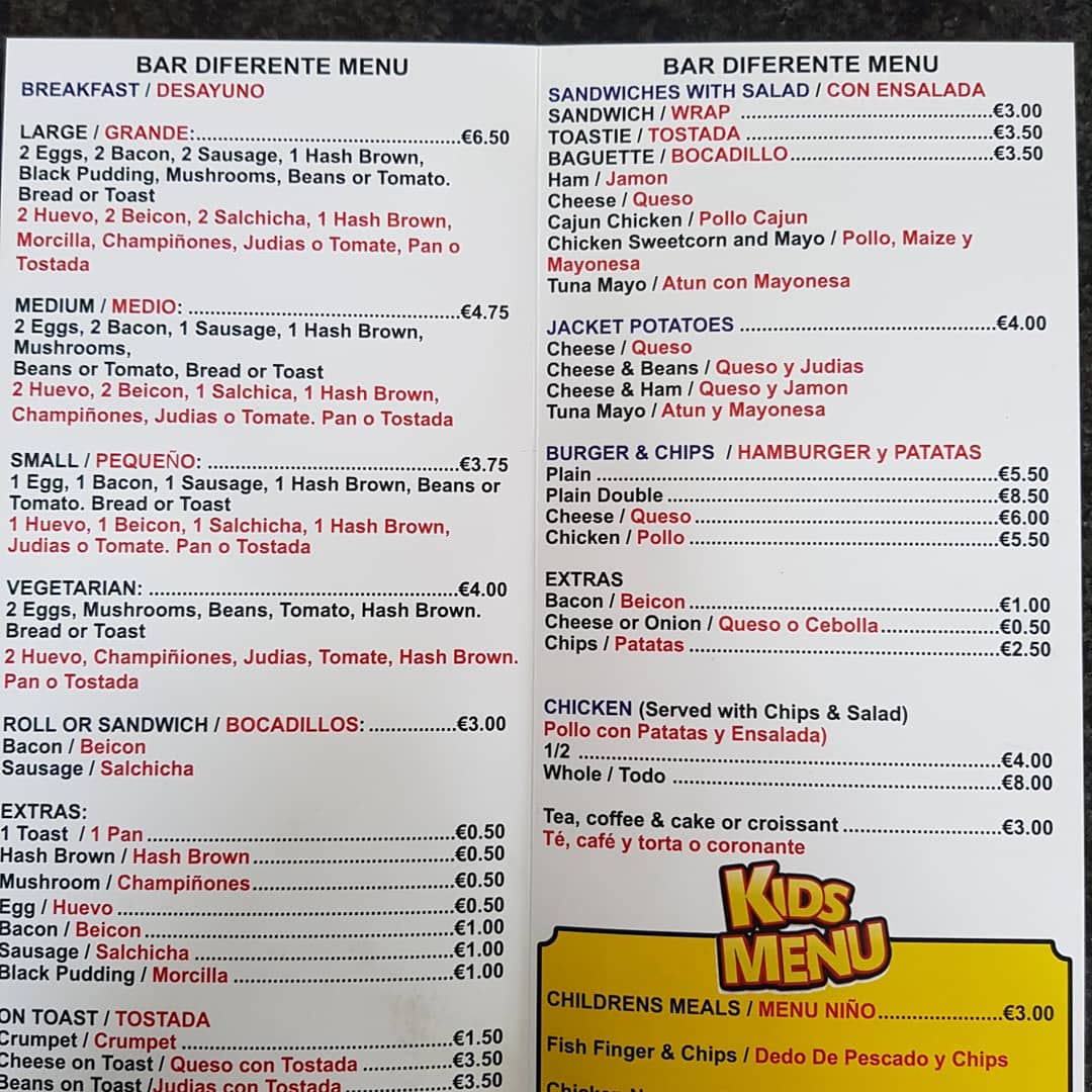 The menu at Bar Diferent offers a variety of food and drink options suitable for different times of the day, including breakfast, light meals, and casual dining. Visitors can expect a selection of coffee and other beverages, accompanied by savory dishes such as kebabs, hamburgers—highlighted by the Hamburguesa Especial—traditional Spanish tapas, and classic items like ensaladilla rusa.